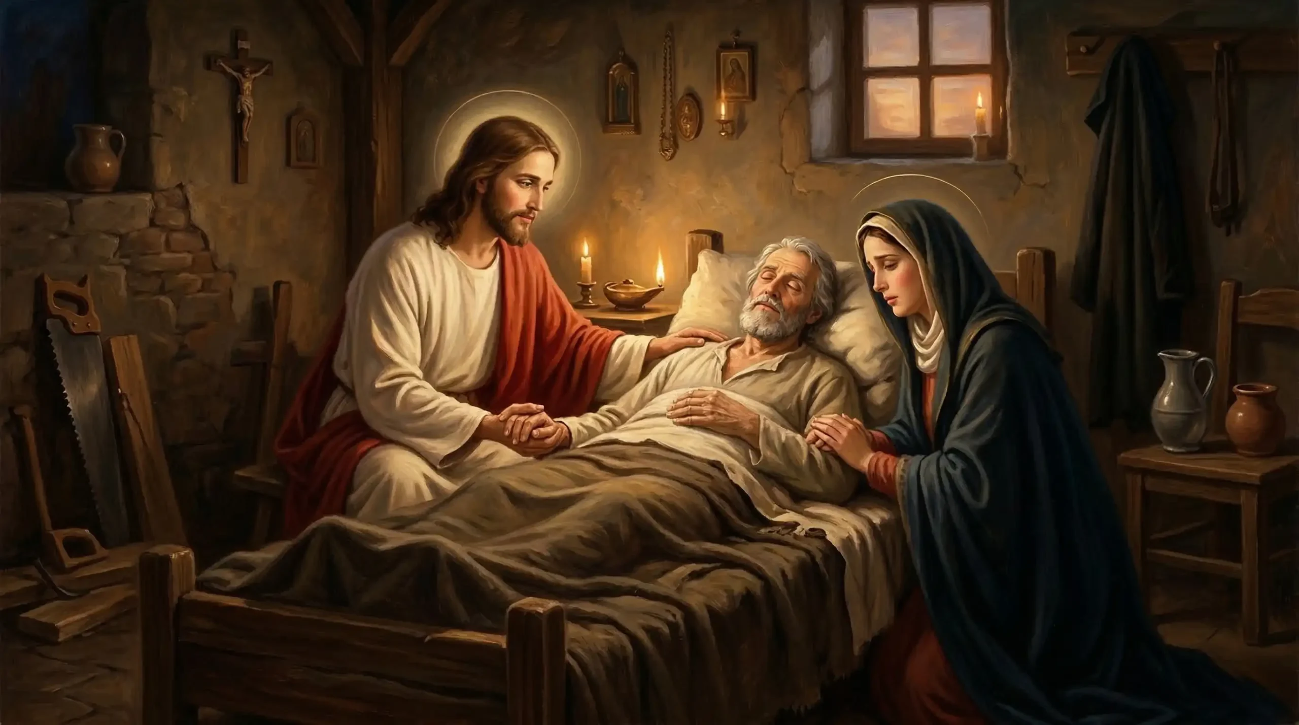 San José es invocado universalmente como patrono de la buena muerte, una devoción enraizada en la tradición de que falleció en Nazaret, en brazos de