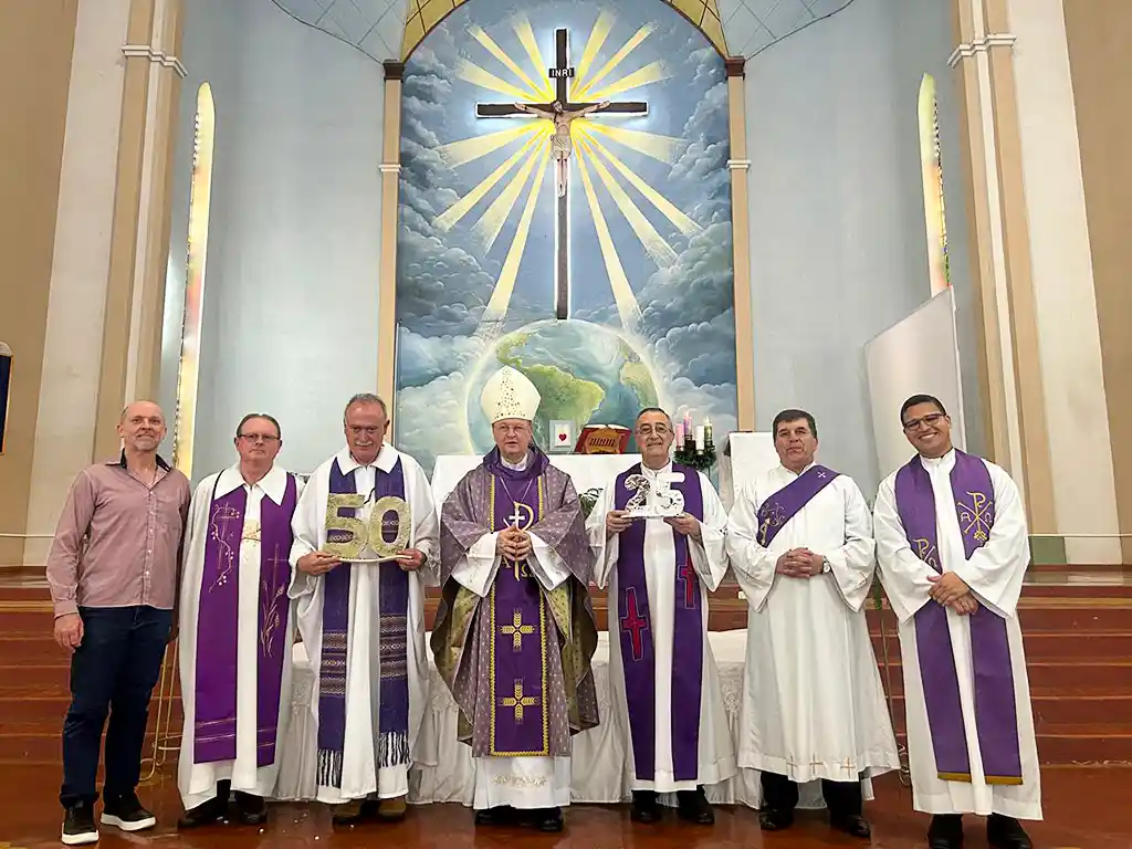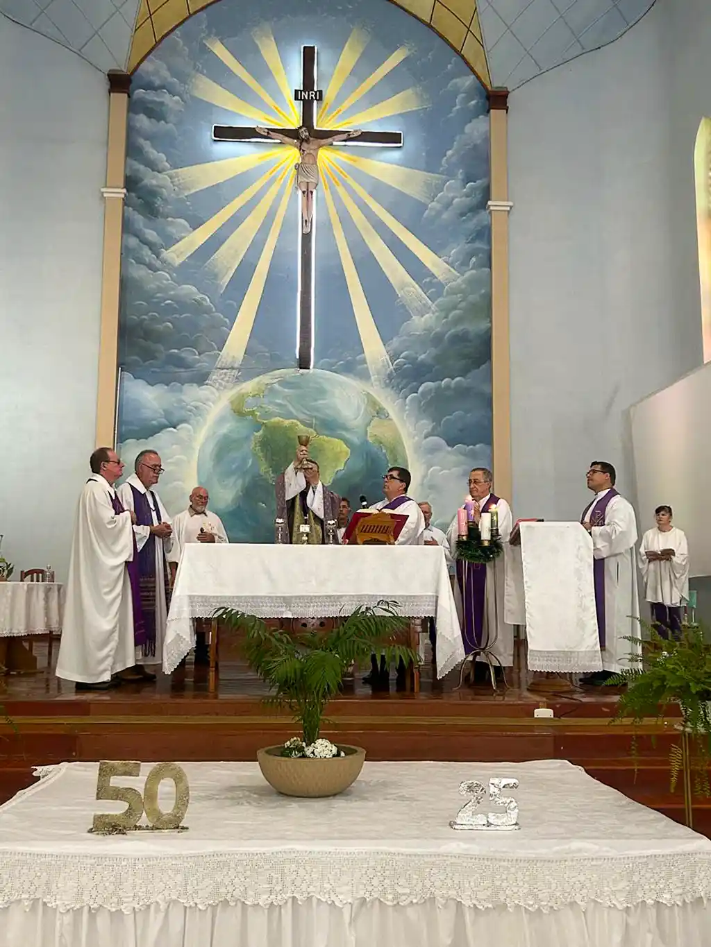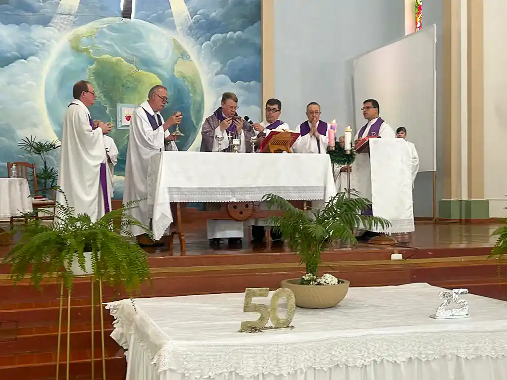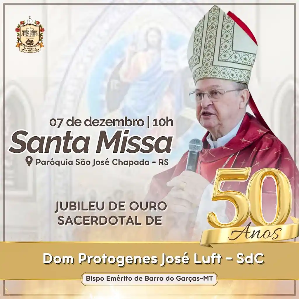 La misa festiva por el Jubileo de Oro de Mons. Protógenes se celebró el 7 de diciembre, en la Parroquia San José, en Chapada (RS), reuniendo a familiares, amigos, religiosos y fieles para dar gracias a Dios por su vida y ministerio sacerdotal.